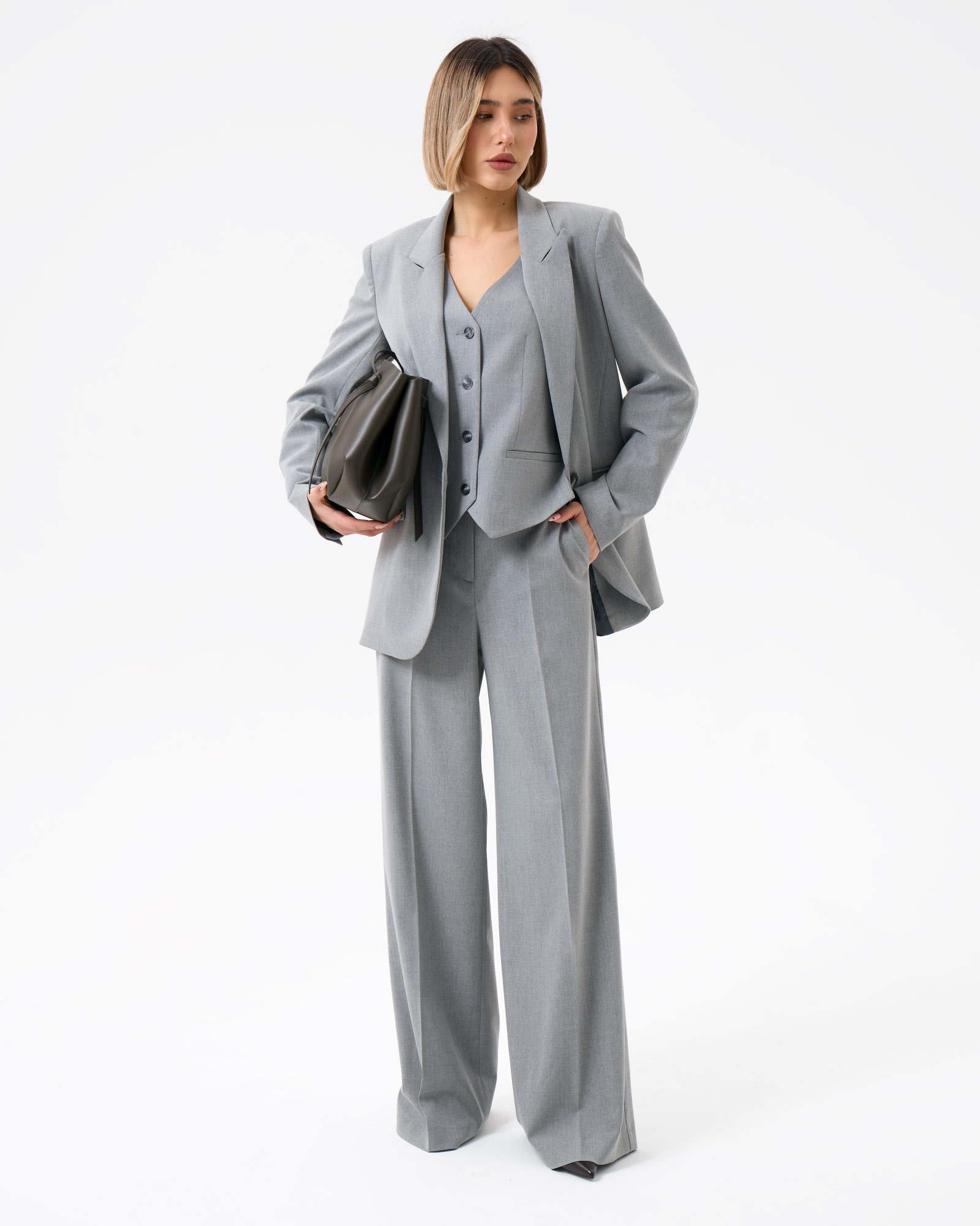 Свободный жакет светло-серого цвета на одной пуговице. Может выглядеть расслабленно или собранно в зависимости от стилизации