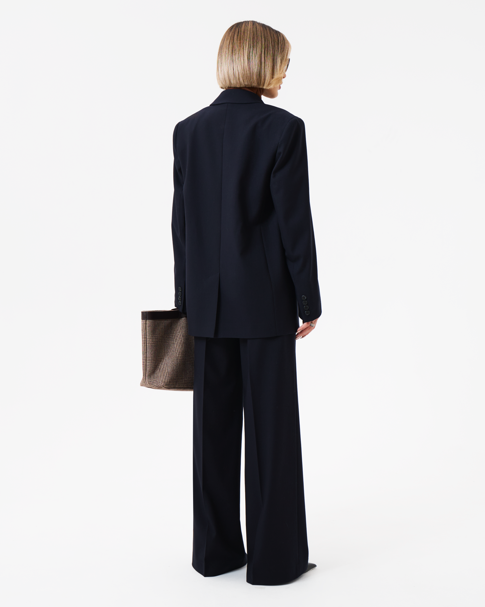 Свободный темно-синий жакет на одной пуговице. Универсальный силуэт для разных образов